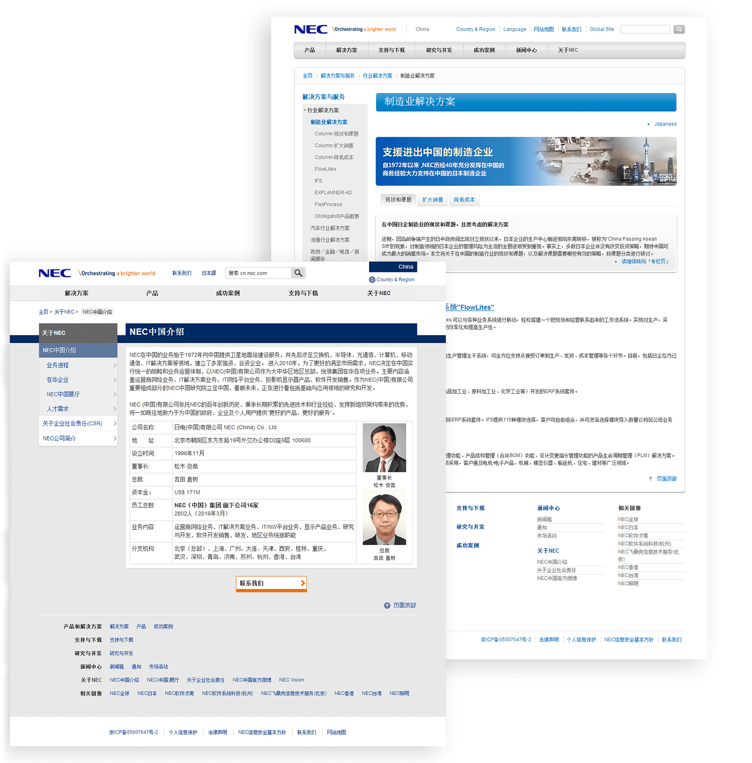 新鴻儒為NEC及旗下子公司建立中文網(wǎng)站群,實(shí)現(xiàn)后臺(tái)統(tǒng)一管理,同時(shí)規(guī)范網(wǎng)站群WEB視覺(jué)識(shí)別體