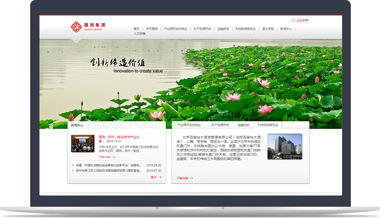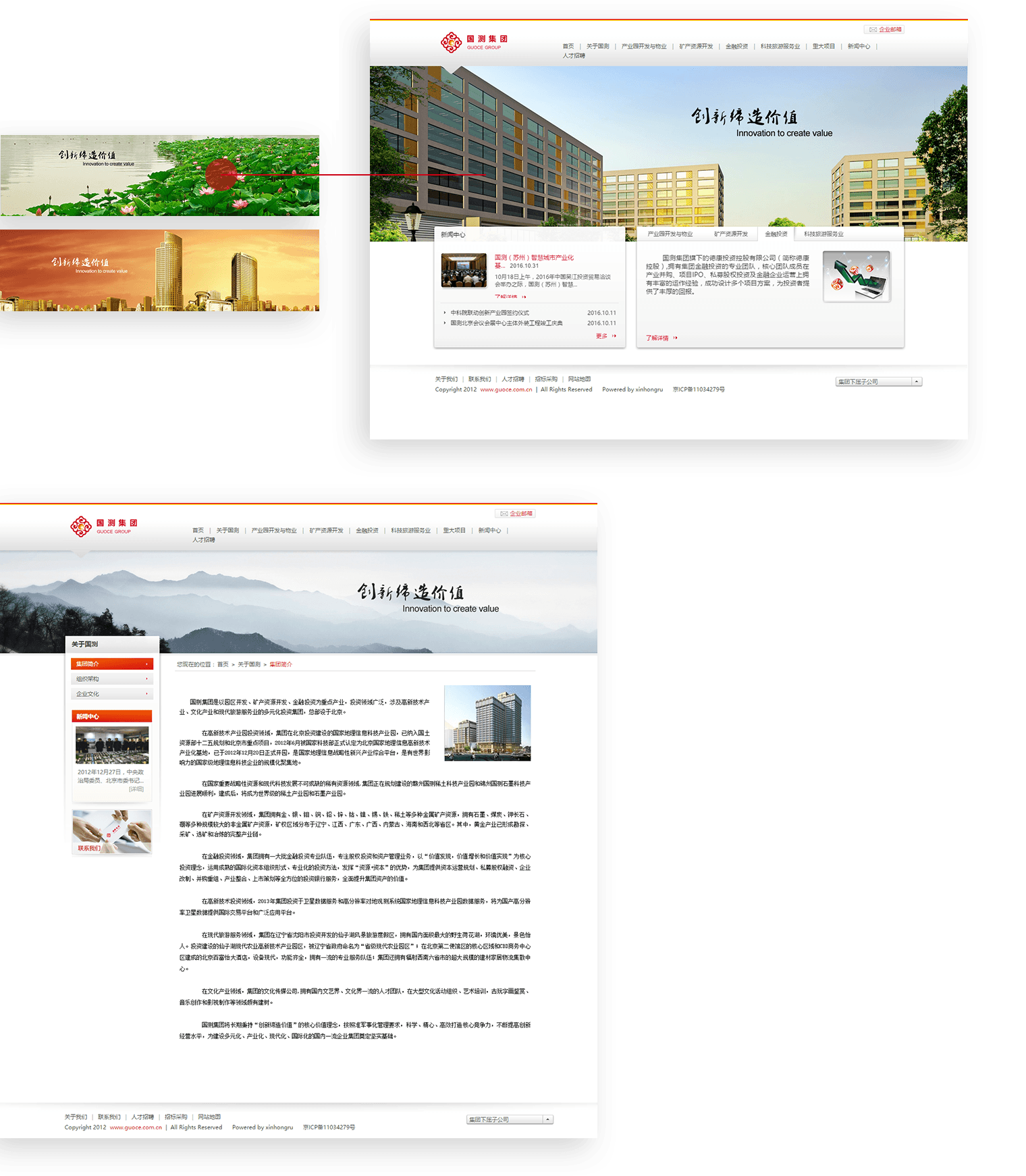 Banner視覺(jué)區(qū)通過(guò)集團(tuán)形象、荷花、業(yè)務(wù)等不同角度進(jìn)行表達(dá),虛實(shí)結(jié)合、業(yè)務(wù)與文化相結(jié)合,塑造