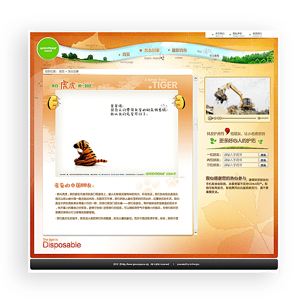 綠色和平網(wǎng)站舉辦《別讓清風(fēng)卷走老虎》等多個(gè)線上公益活動(dòng),吸引用戶參與。新鴻儒長(zhǎng)期負(fù)責(zé)其網(wǎng)站的維護(hù)和運(yùn)營推廣工作,保障網(wǎng)站穩(wěn)定、有效運(yùn)行。