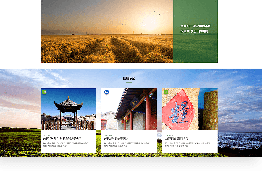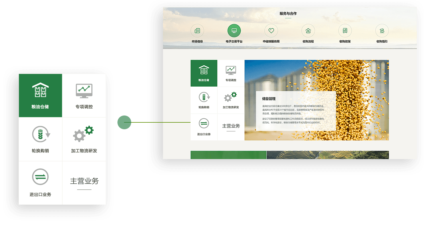 中儲糧官網(wǎng)采用扁平化ICON的方式,集中展示儲備管理、輪換購銷、專項調控等多元業(yè)務,在保證用戶便于閱讀的基礎上,通過創(chuàng)意、交互吸引用戶關注。